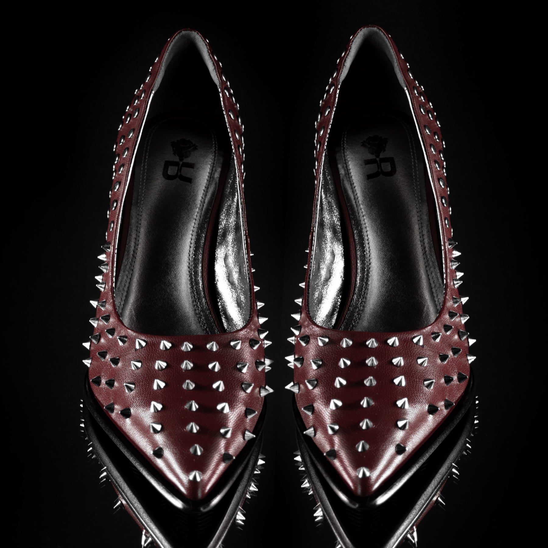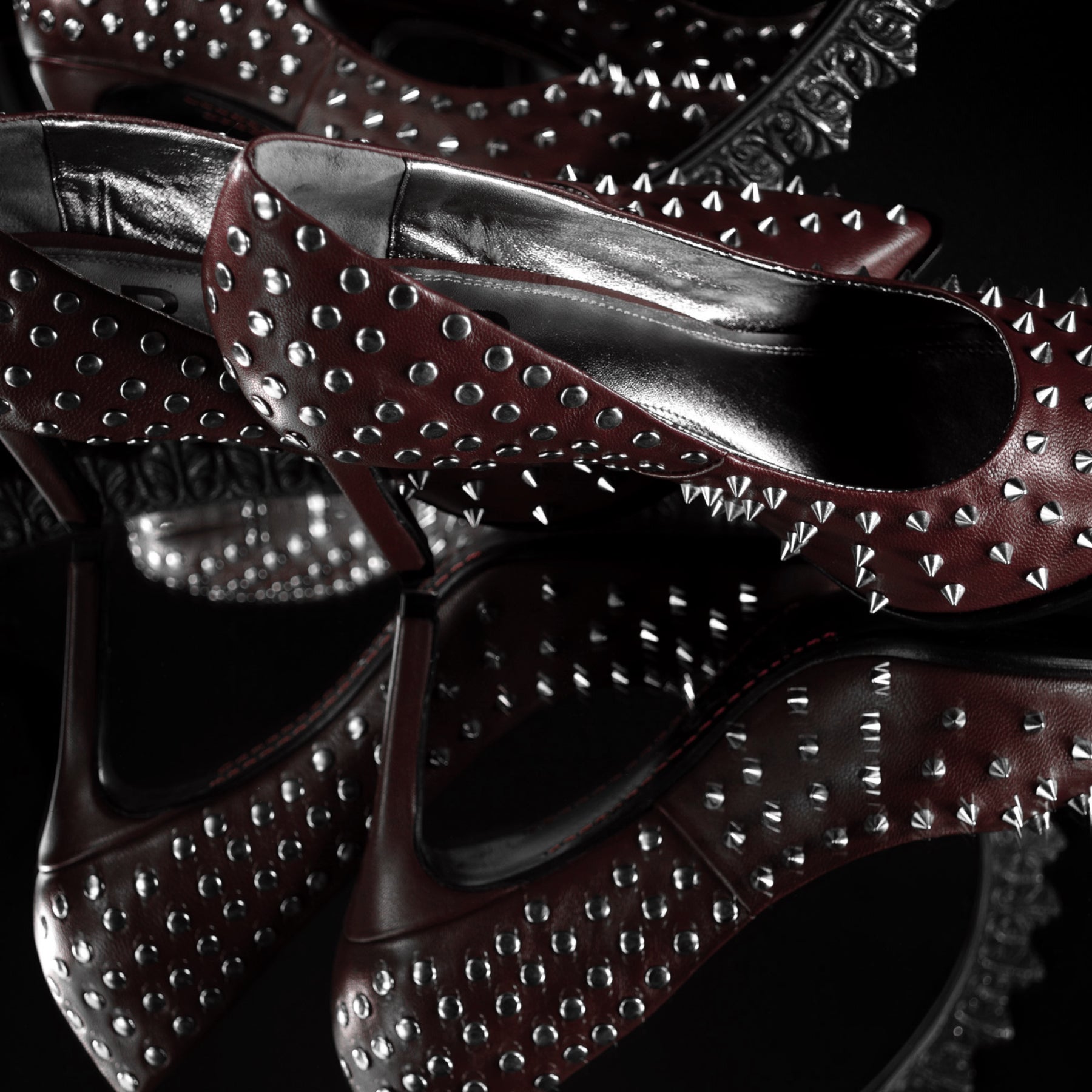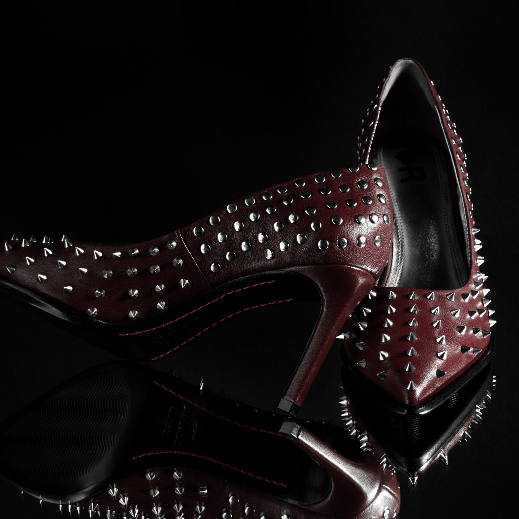 O scarpin Elaine B é a tradução de uma elegância com linhas puras e atemporais que ganham tensão na simetria dos spikes e rebites.