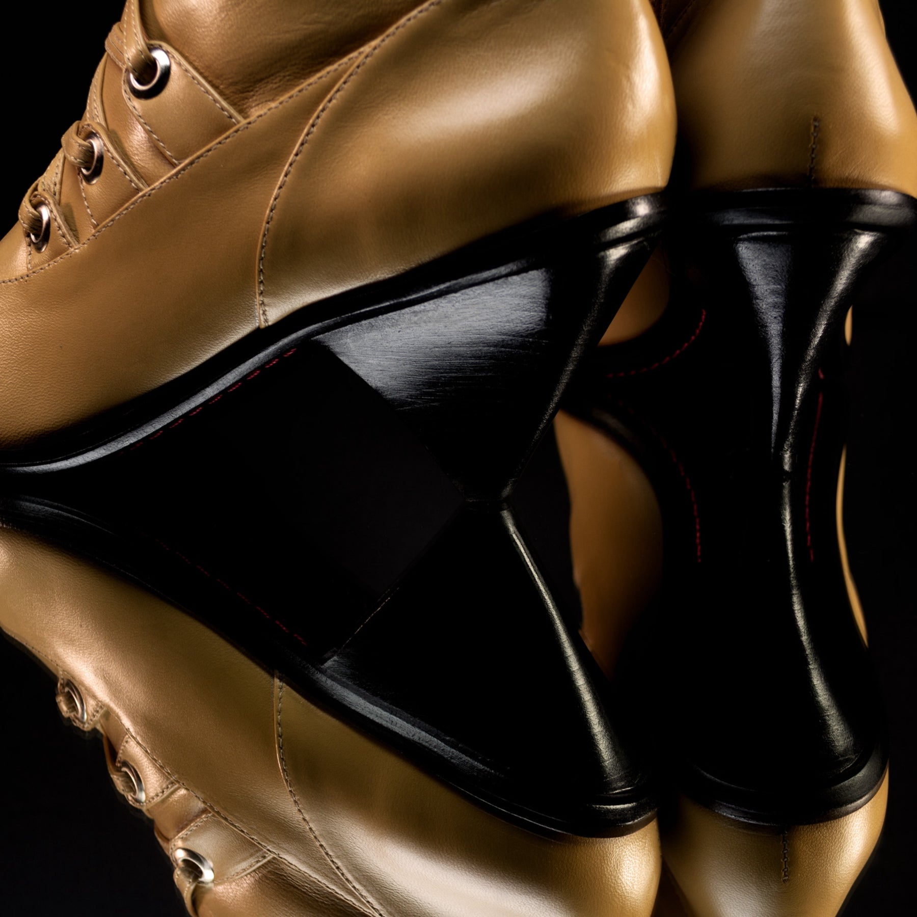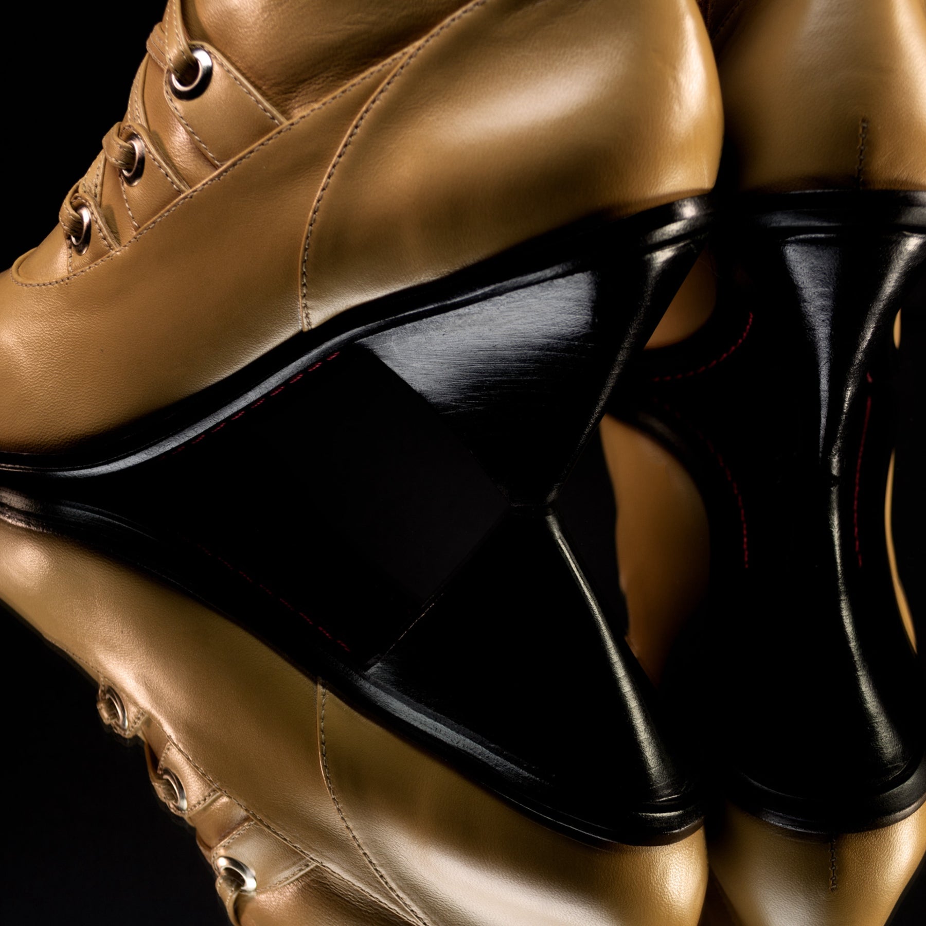 O salto geométrico de 5 cm, no formato square pyramid, completa o design com presença arquitetônica e estabilidade.