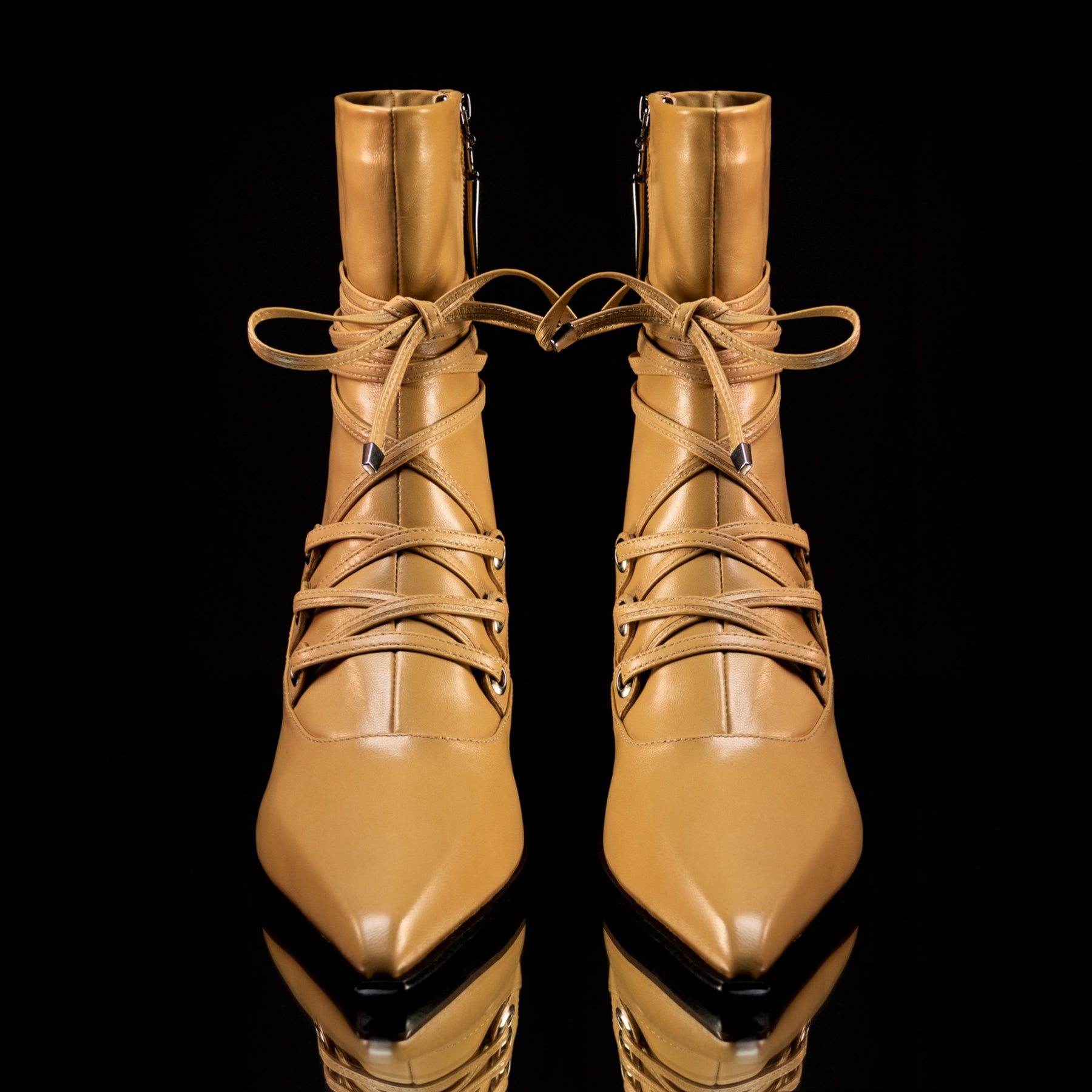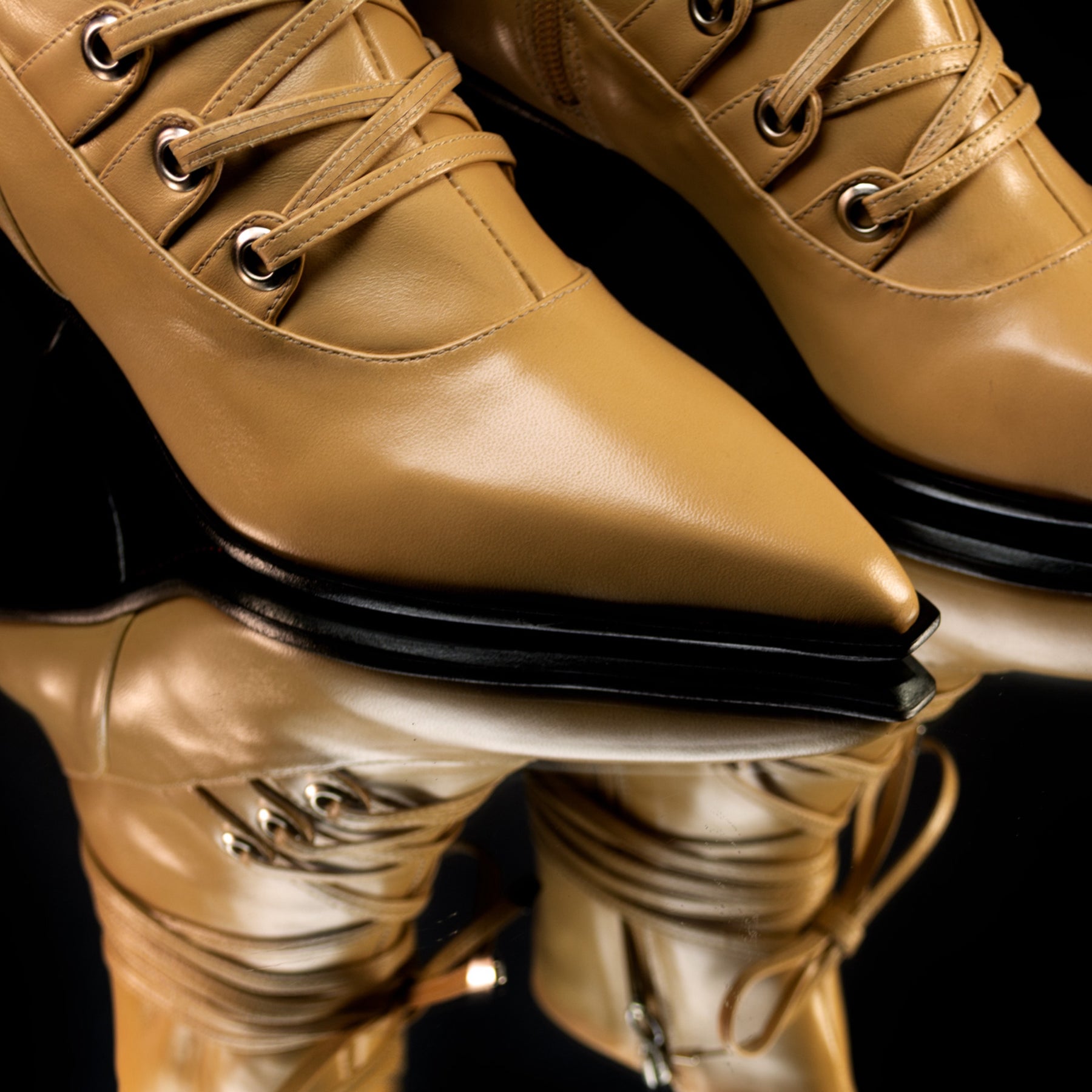 O cano em pelica stress molda suavemente a silhueta, enquanto o cordão longo em pelica envolve o tornozelo em um gesto de estilo e personalidade.