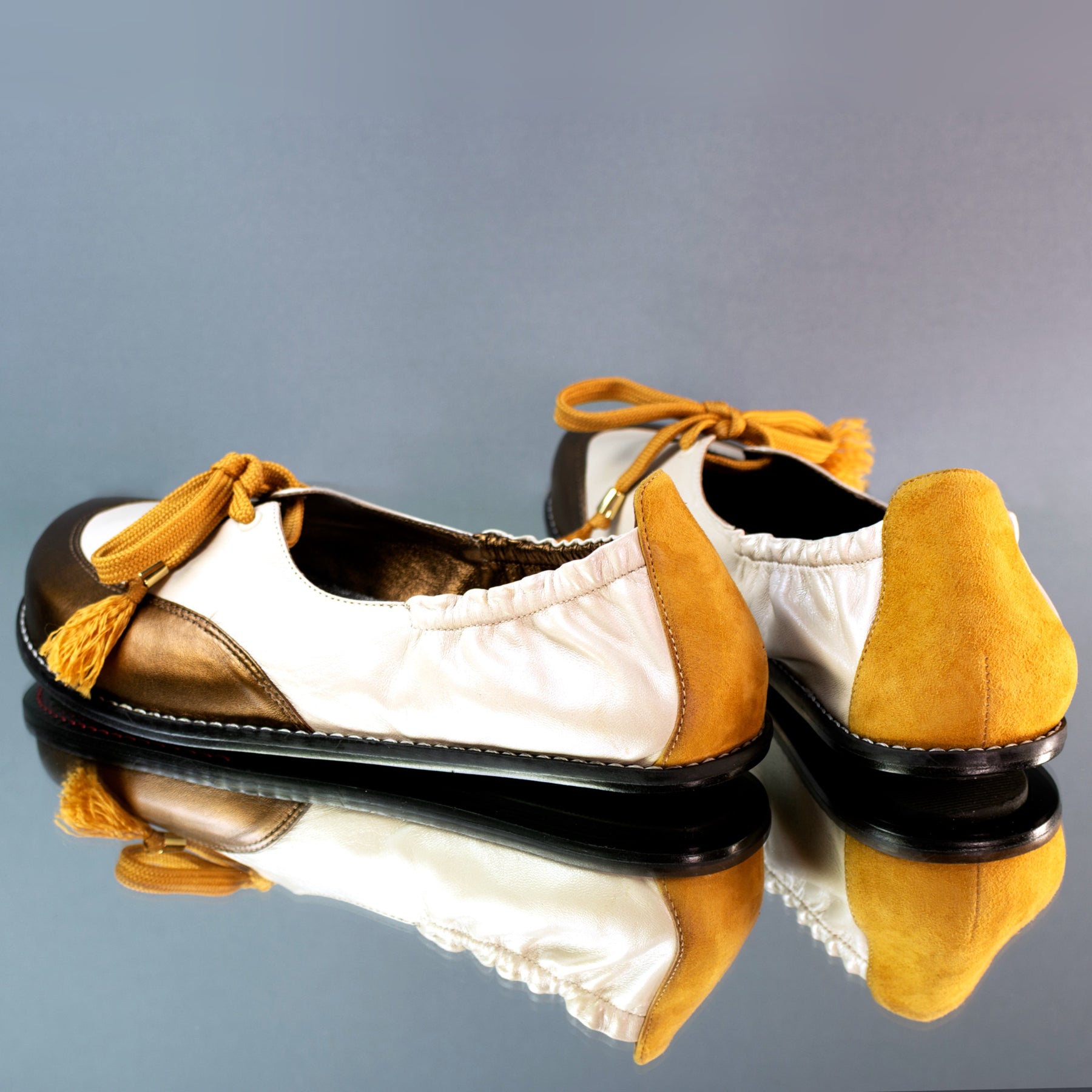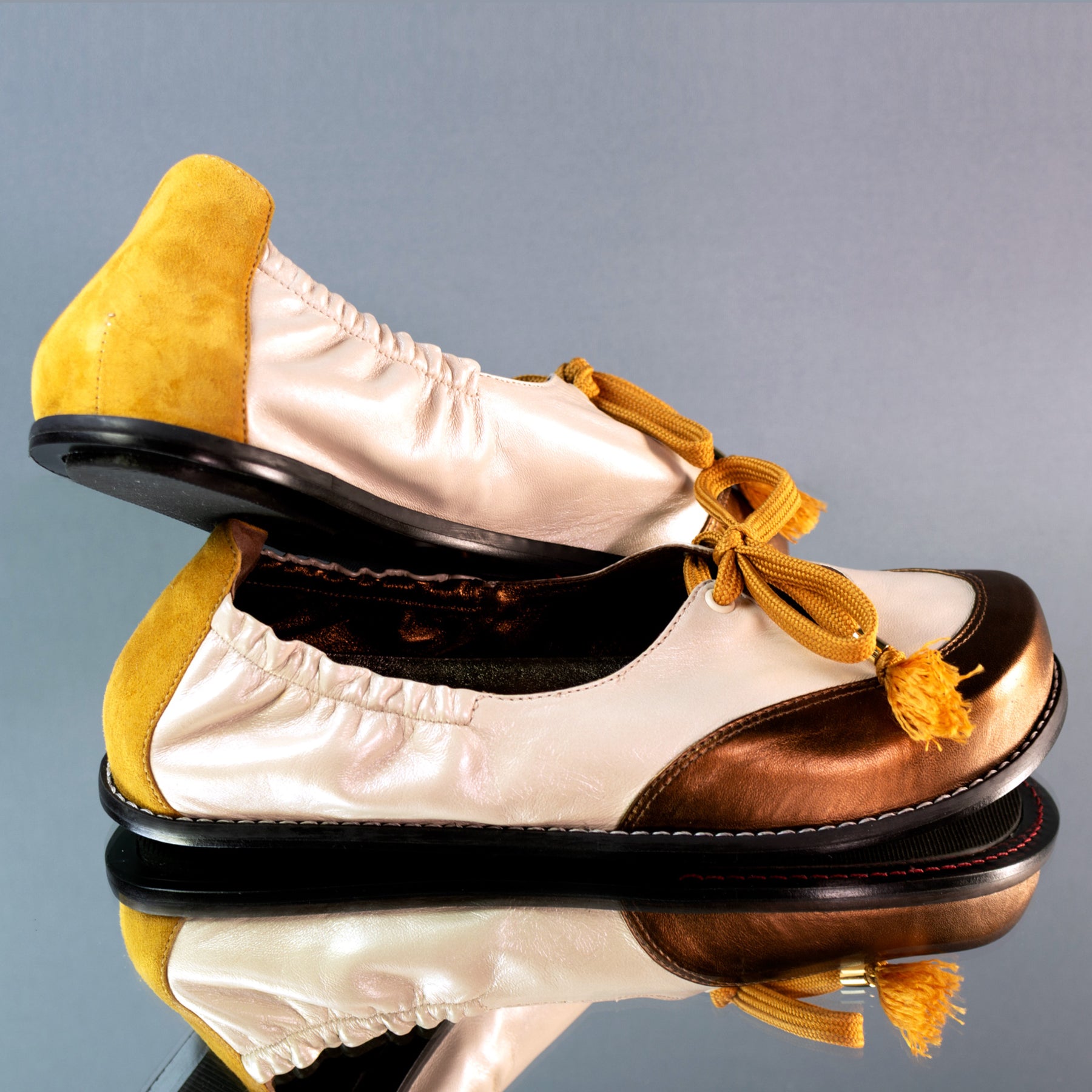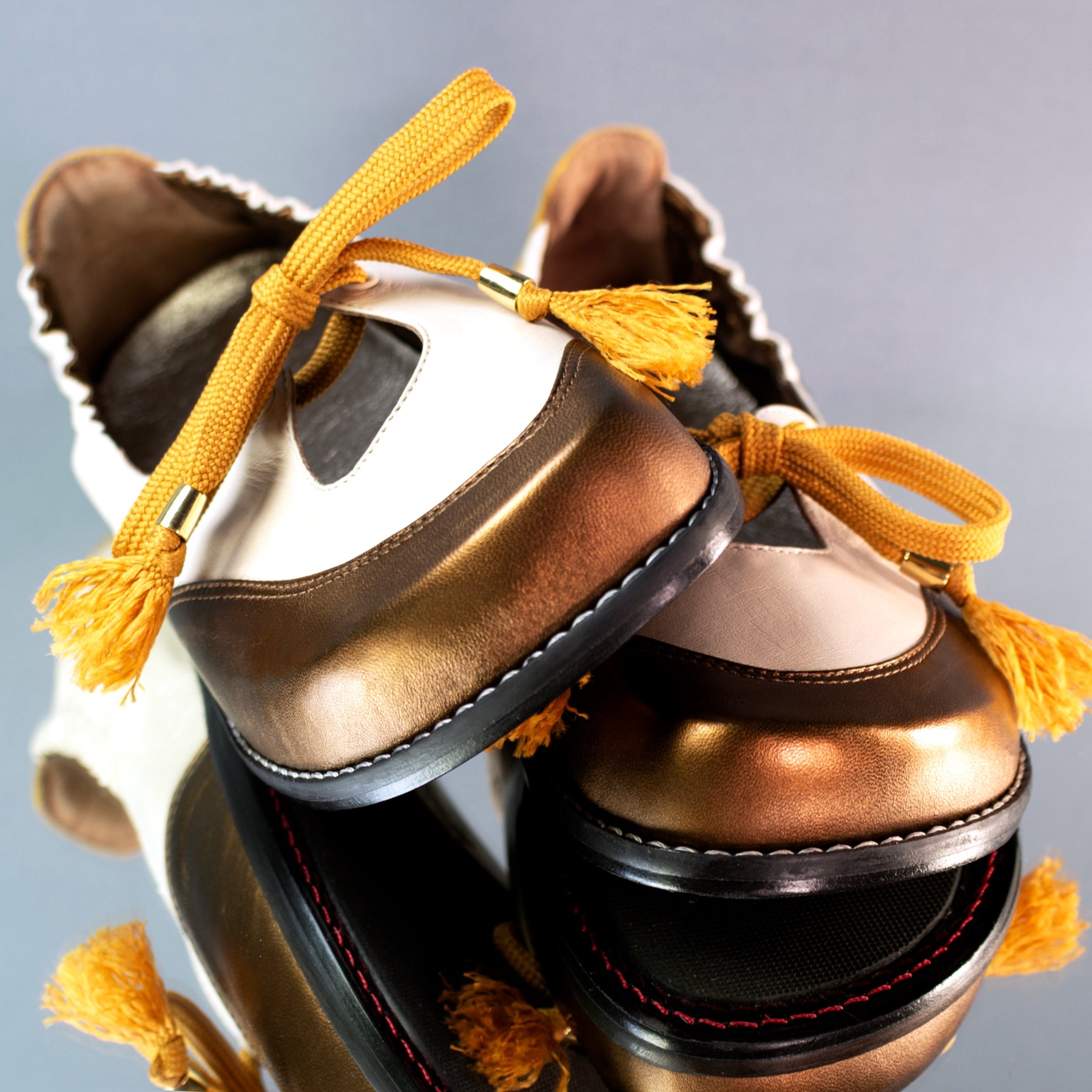 • Cadarço: mostarda com acabamento desfiado e ponteiras metálicas, em contraste elegante com o corpo do modelo